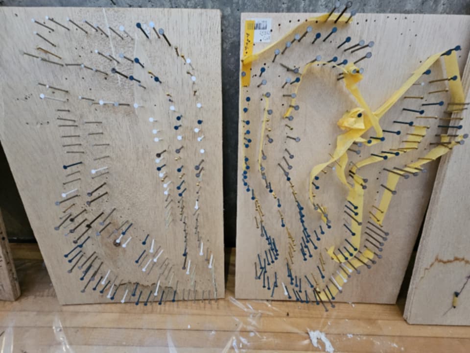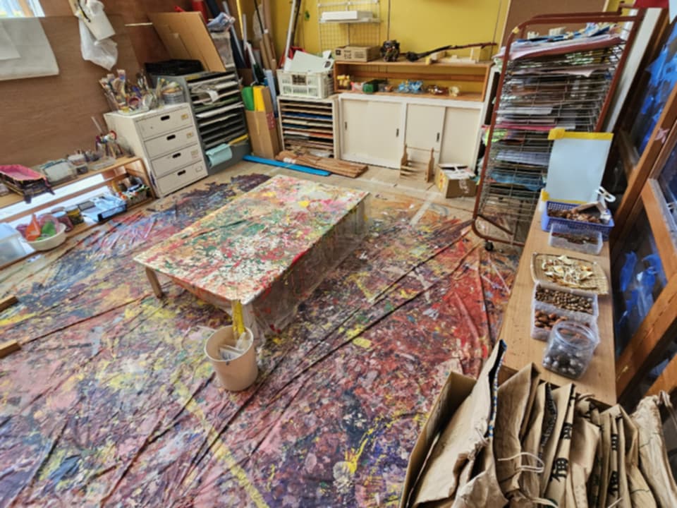 アトリエの床に残る絵の具の跡は、消し忘れではない。歴史であるし、吊るされた素材は、装飾ではなく、「まだ何かになる途中」の気配だ。窓越しの庭は、外ではなく、