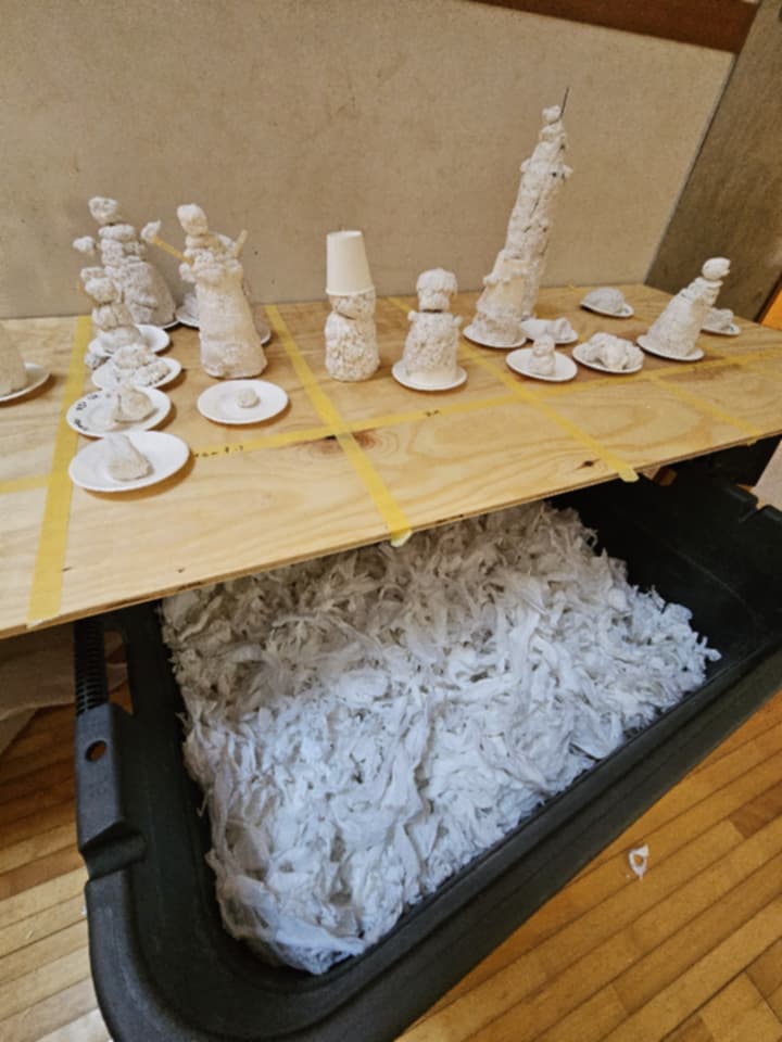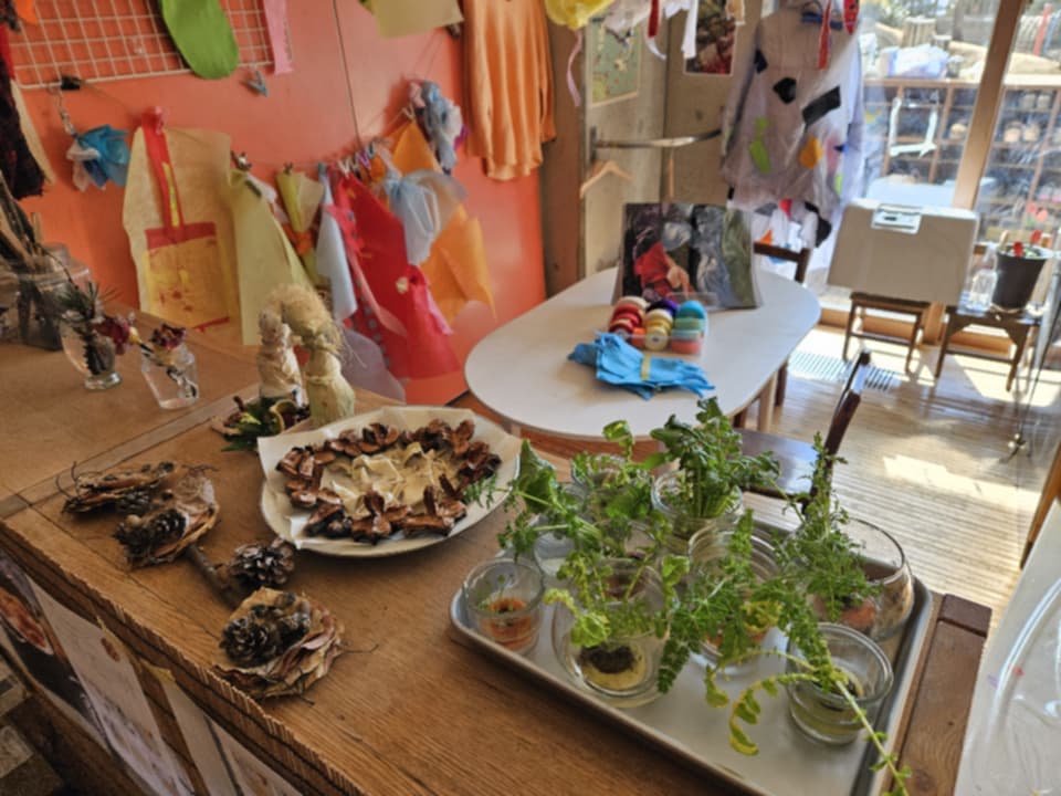 園に一歩足を踏み入れた瞬間、まず感じたのは「余白」でした。余白といっても、何もないわけではない。むしろ、素材は豊かにある。窓辺には乾いたとうもろこし。光の入るテーブルには、芽吹きかけた人参。絵の具の飛沫が残るアトリエ。色布が風に揺れる制作棚。どんぐりや柑橘の皮が無造作に、しかし丁寧に置かれている。けれど、どこにも「やらされる空気」がない。あるのは、「ここに居ていいよ」という言葉で表せない「許可」という空気感。