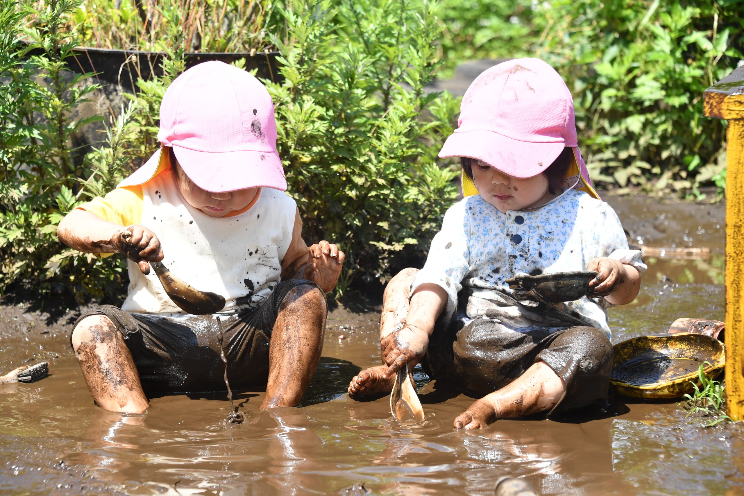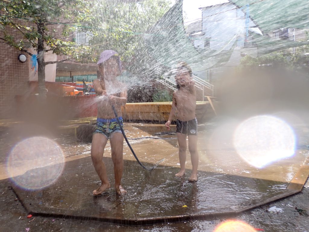 一方、園庭はどうか。風が吹き、地面は凸凹し、虫が現れ、土は濡れ、空は変わる。そこは予測できない半自然の空間である。誰かが完全にコントロールしているわけではない。そこでは、物は物のままで意味を持つ。水は水として、土は土として、坂は坂として、子どもに迫ってくる。園庭の遊びは、世界そのものと直接関わる遊びだ。