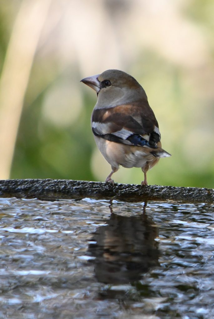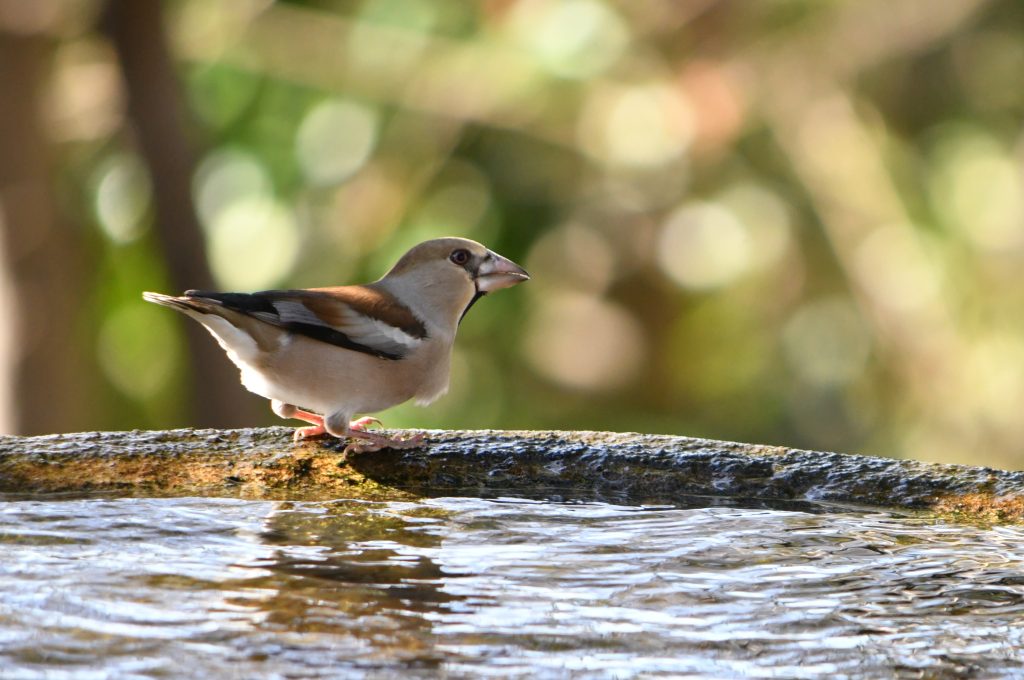 木漏れ日が差し込む水場で足を止め、耳を澄ますと、どこからかメジロ、シジュウカラ、エナガ、ヤマガラ、そしてシメなどなどが交互に水を求めてやってくる。違う姿、違う声、違うリズムの鳥たちが、ひとつの群れとして動いている。