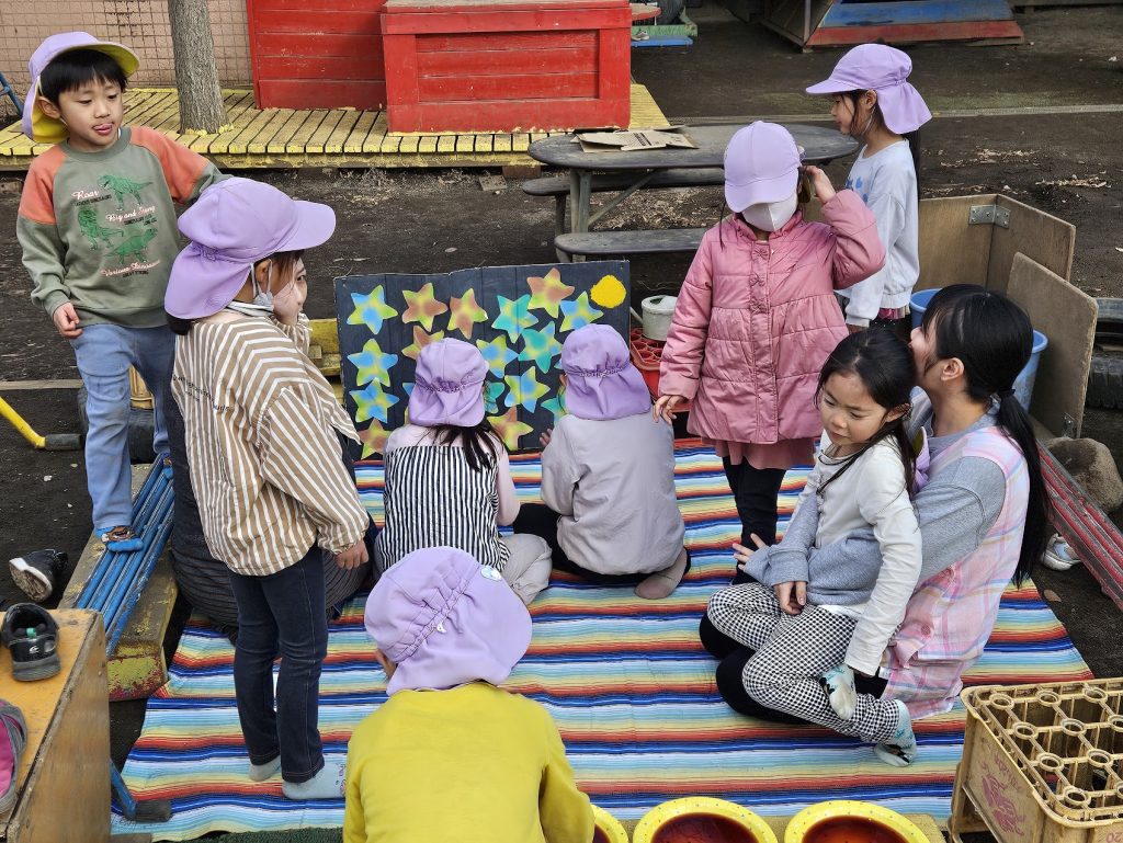 さらに今日は、ただおもちを食べるだけではありません。子どもたちは、自分たちで作った空間に、お世話になった職員を呼びもてなしました。今年度異年齢クラスが大切にしていたテーマでもあるのですが、これは、単なるごっこ遊びではなく、関係性の主体になる経験をしてもらいたいためでもあります。
